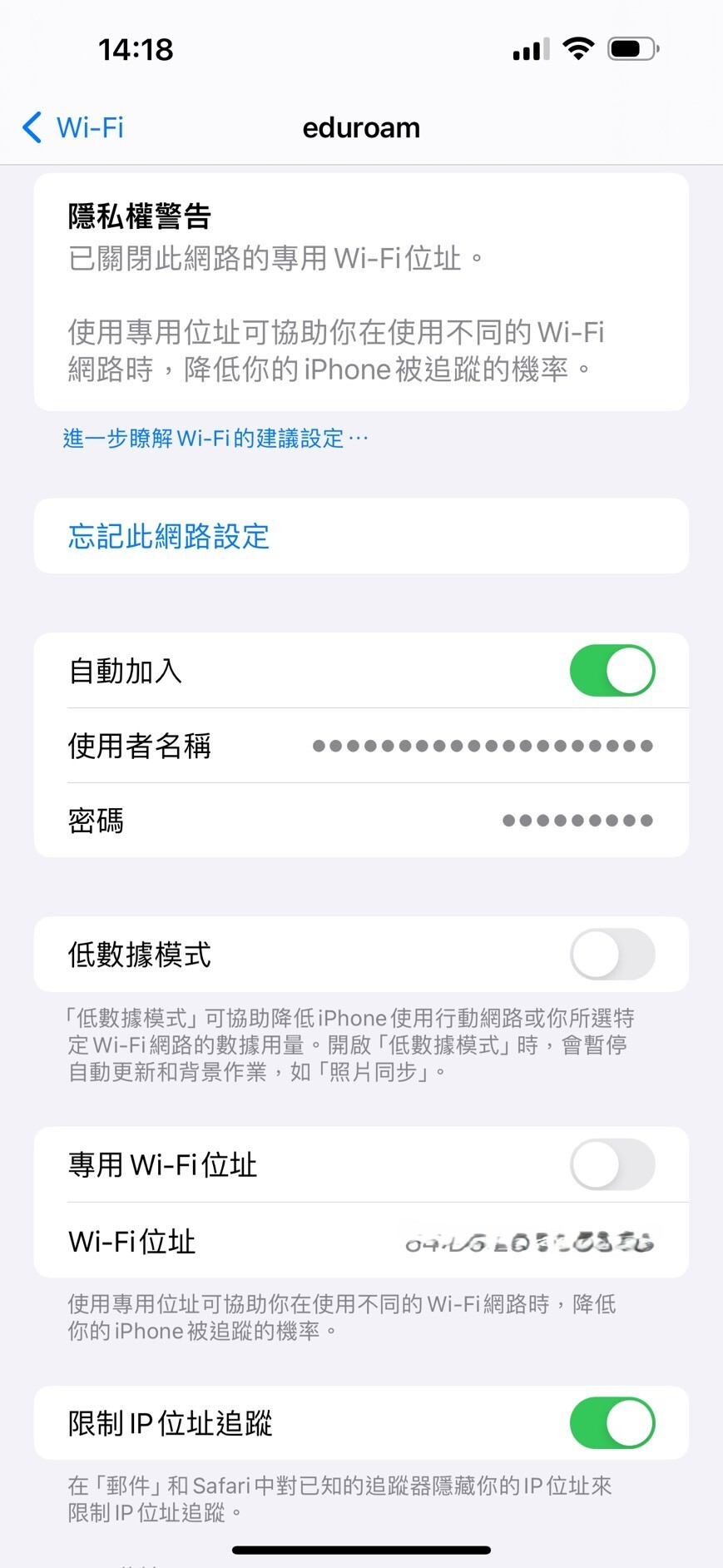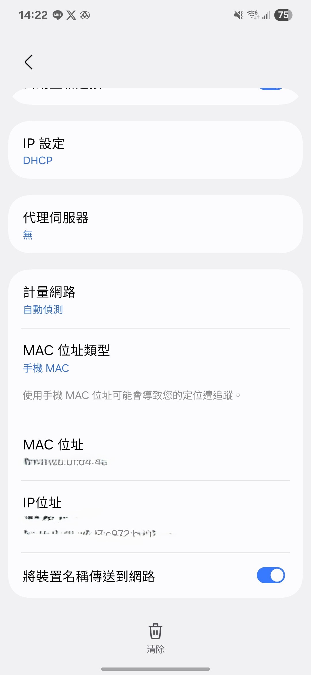 請關閉專用Wi-Fi位址或MAC位址類型選擇手機MAC,以免造成連線異常(網速下降)